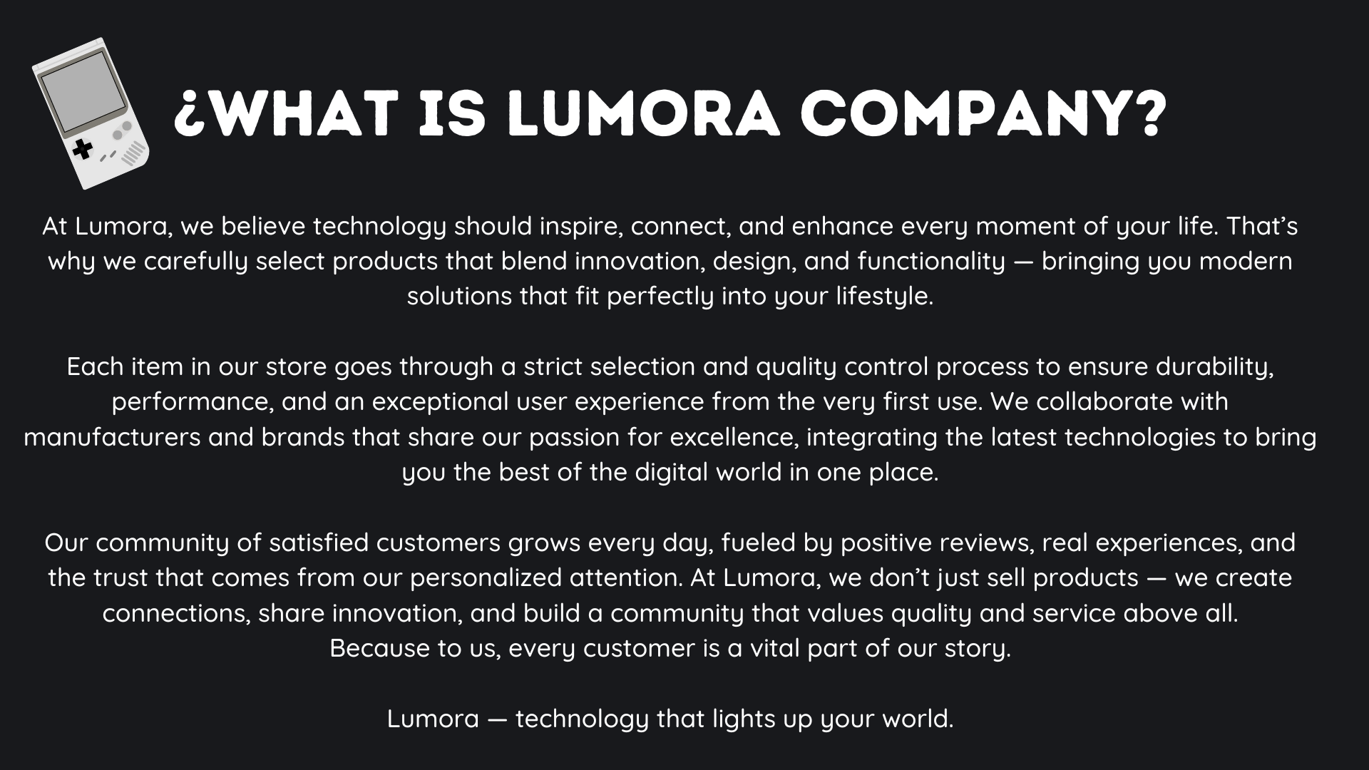 At LUMORA, we combine minimalism, technology, and ambiance to create products that enhance your home’s atmosphere.