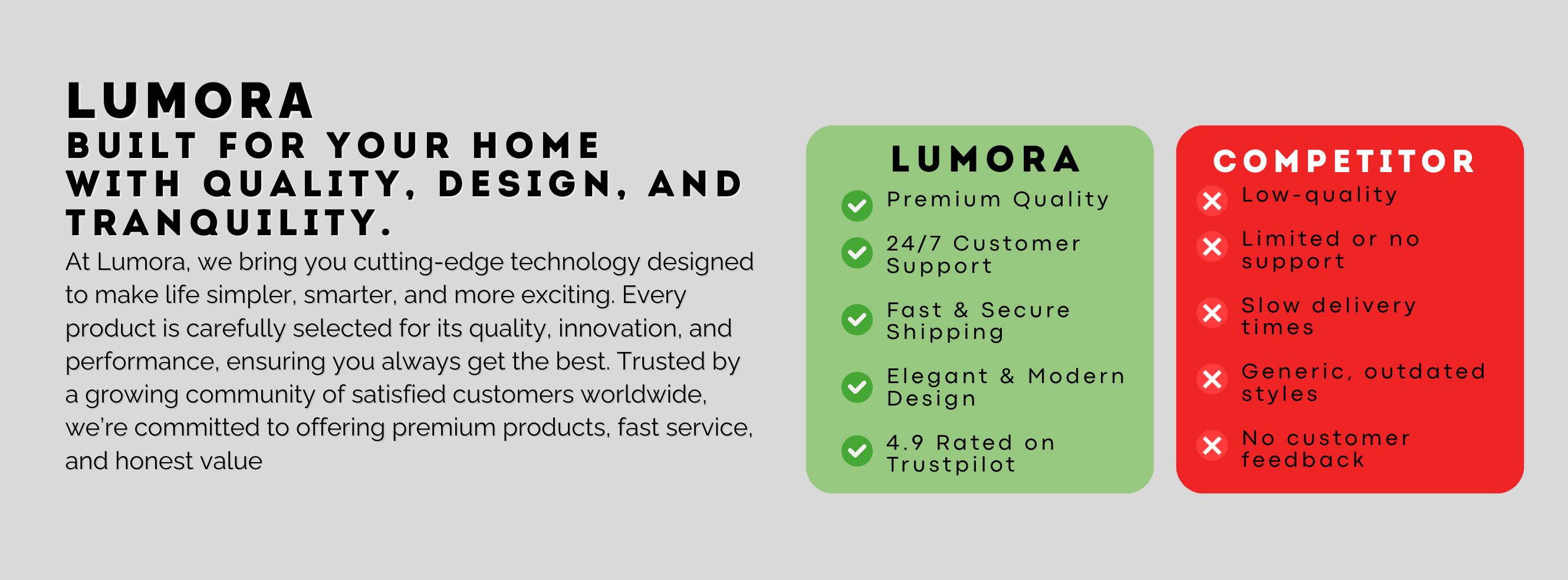 Every LUMORA product is crafted using high-grade materials and tested for durability, performance, and safety.